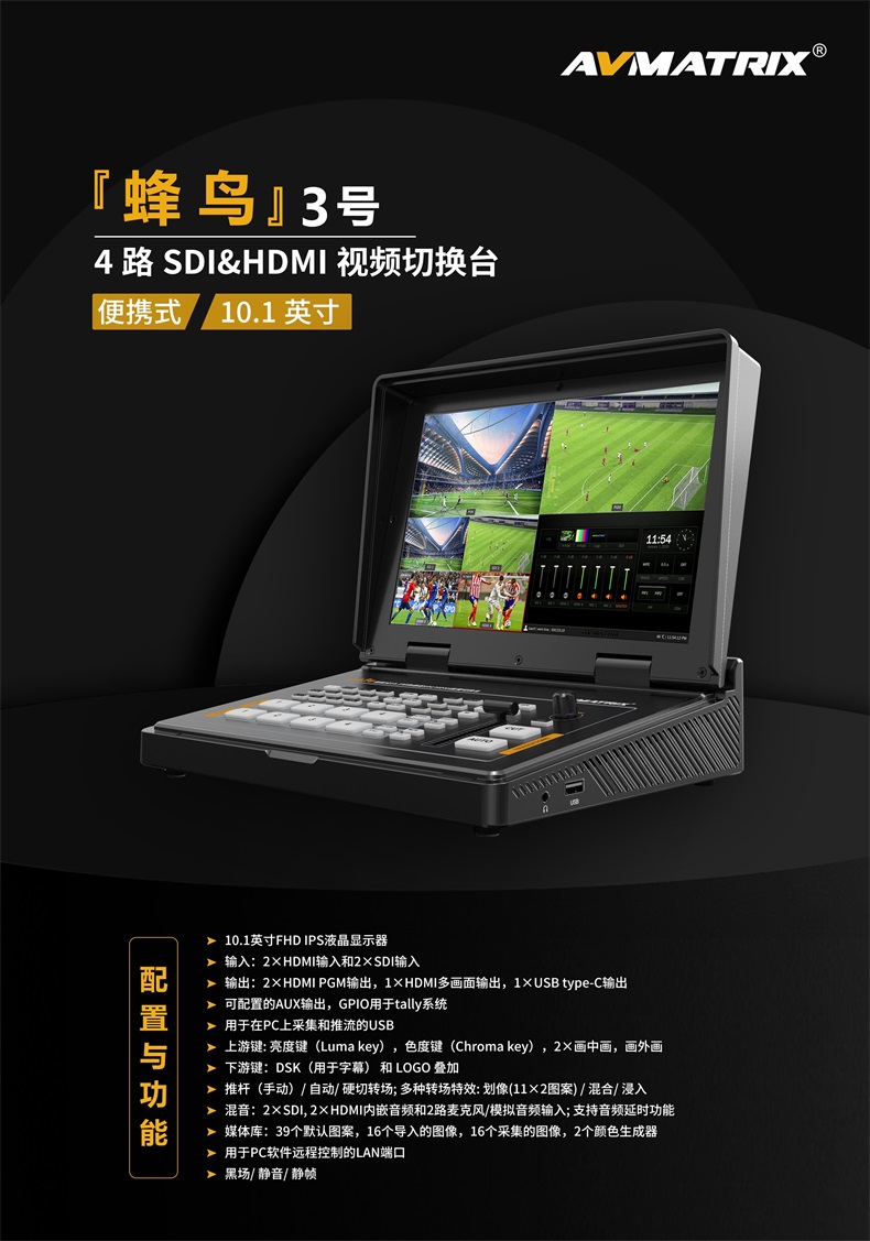 蜂鸟3号丨便携式10.1吋四通道SDI/HDMI直播切换台