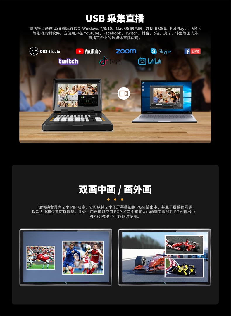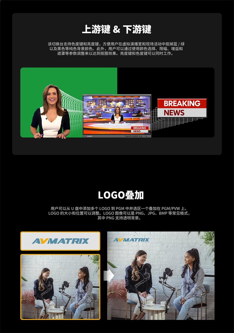 *上游键: 亮度键,色度键,2×画中画,画外画