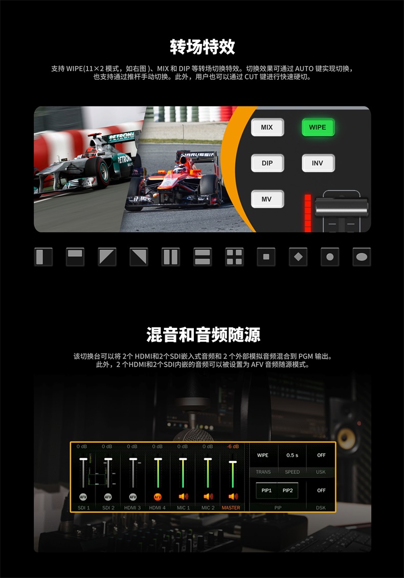 *推杆/自动/硬切转场; 多种转场特效: 划像(11×2图案)/混合/浸入