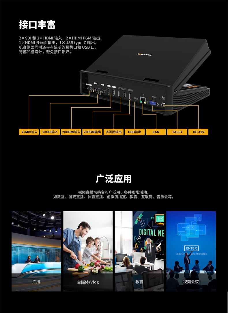*混音:2×SDI, 2×HDMI内嵌音频和2×麦克风/模拟音频输入